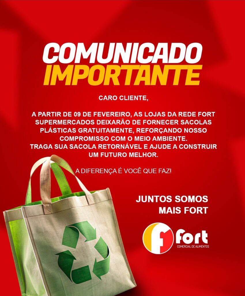 Reforçando seu compromisso com o meio ambiente, as lojas da rede Fort Supermercado emitiu um comunicado importante para seus clientes, que a partir do dia 9 de Fevereiro, deixarão de fornecer sacolas plásticas gratuitas.