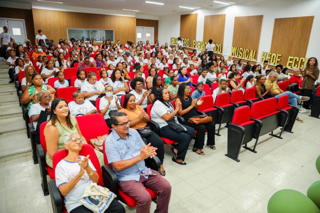 Os coralistas que fazem parte do projeto Coral Municipal da Prefeitura de Candeias participaram na manhã deste sábado (8) do Encontro Pedagógico Musical da Rede ECCP. A ação musical foi realizada no auditório do Colégio da Polícia Militar (CPM).