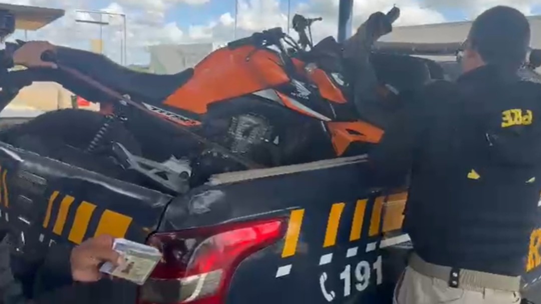 Ao verificar o bagageiro do veículo, os agentes encontraram a motocicleta. O veículo possuía uma queixa-crime no estado de São Paulo, e era utilizado com uma placa de outro veículo licenciado do município de Alagoinhas.